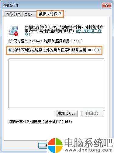 (4)点击“数据执行保护”选项卡。选择“为除下列选定程序之外的所有程序和服务启用DEP(U)”。