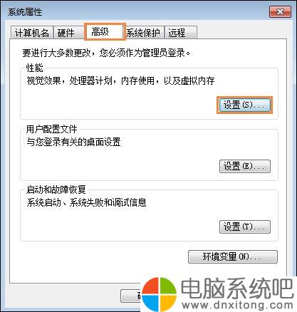 (3)在弹出的窗口中选择“高级”,再选择性能栏里的“设置” 。