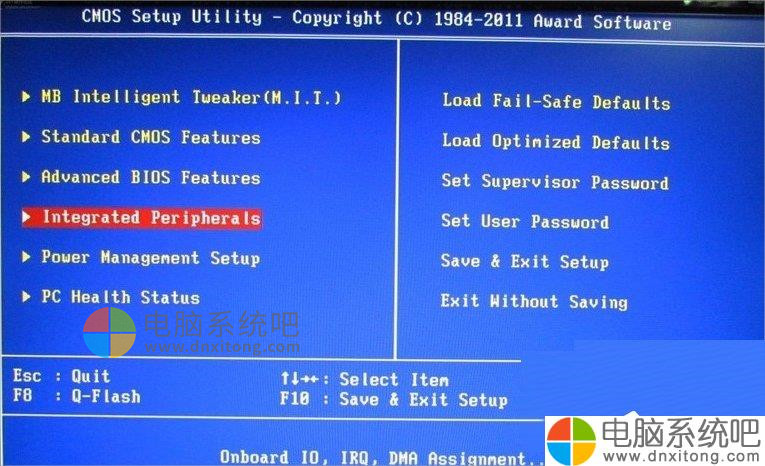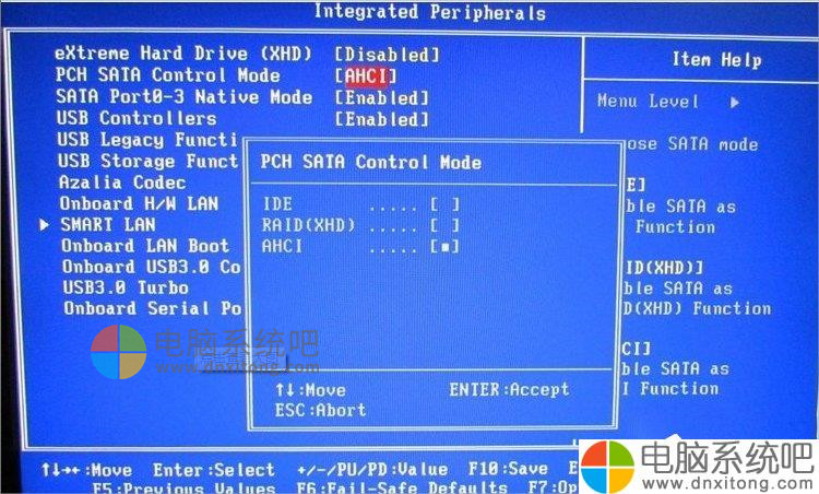 3、重启电脑之后,连续按DEL,进入BIOS,在“Integrated Peripherals”页面中,将“SATA RAID/AHCI Mode”更改为“AHCI”(不同BIOS选项名称会有细微差别)。