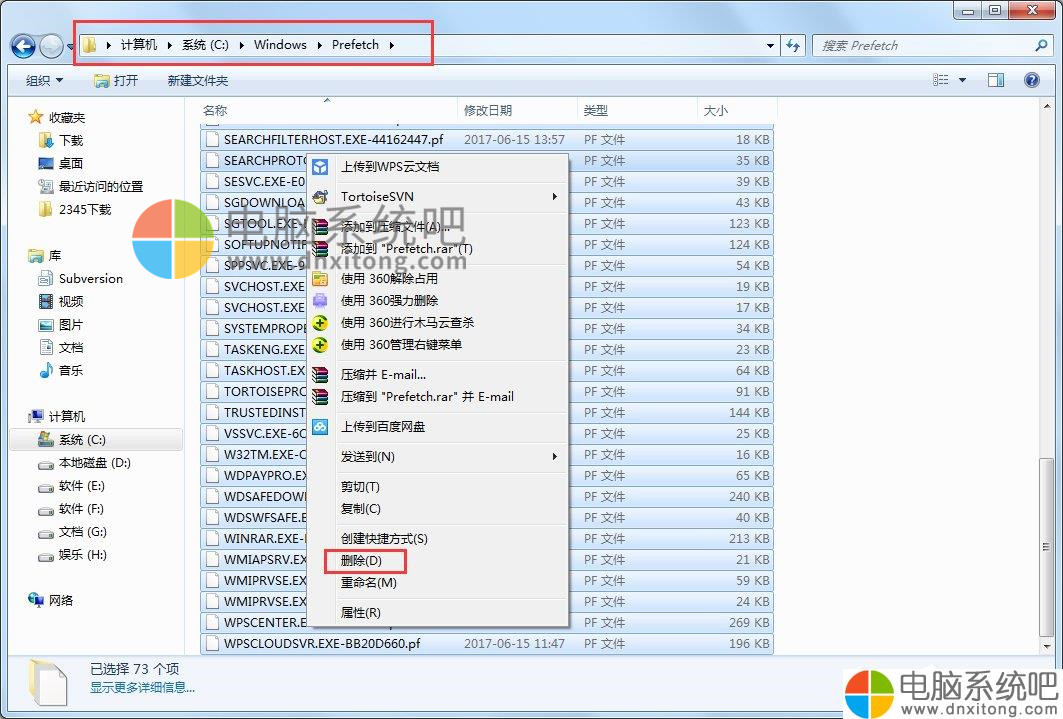 3、直接把C:/windows/prefetch文件夹中的文件通通删除即可。