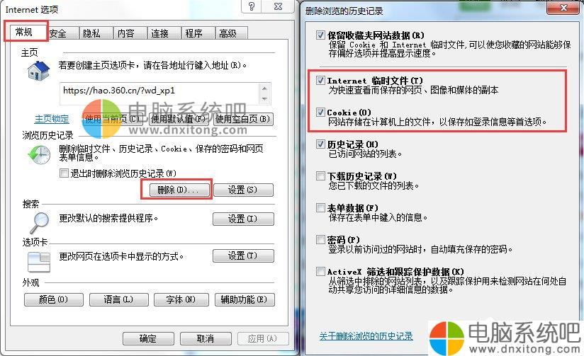 5、清理IE等浏览器产生的临时文件:打开控制面板选Internet选项,删除Cookie和IE临时文件。