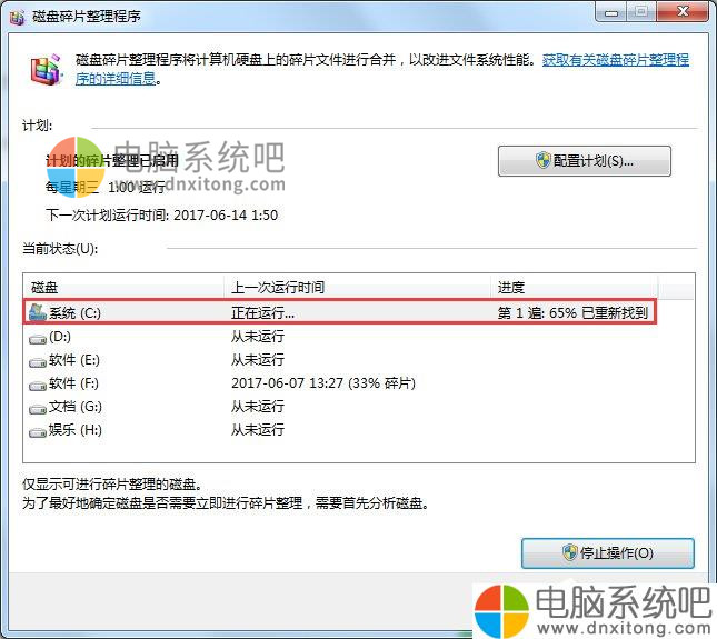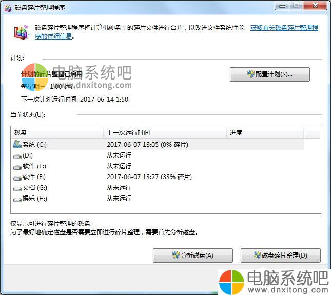 2、“磁盘碎片整理程序”打开后,如下图所示: