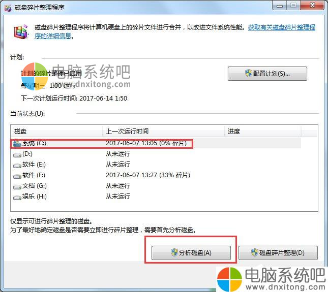 3、为了最好的确定磁盘是否需要进行磁盘碎片整理,一般要对磁盘当前的状况进行分析,分析后,我们再决定是否要对磁盘进行碎片整理,若是碎片不多,那么无需进行磁盘整理,先选择要分析的磁盘,然后点击下面的“分析磁盘”按钮。