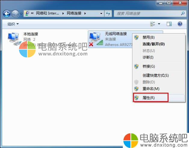 3、接着右击“无线网络连接”,打开“属性”项。