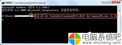 2、在命令提示符下输入for %1 in (%windir%\system32\*.dll) do regsvr32.exe /s %1;