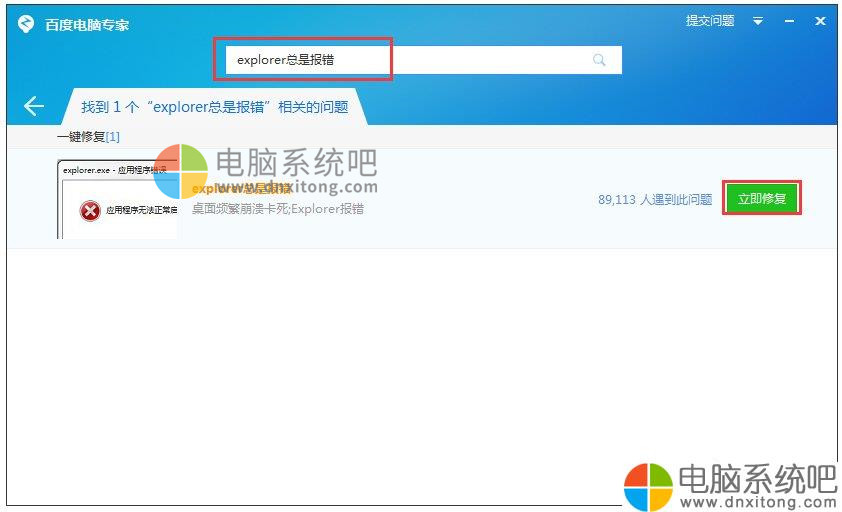 建议下载并安装【百度电脑专家】,打开【百度电脑专家】,在搜索框内输入“explorer总是报错”,在搜索结果里面选择【立即修复】,修复完成后重启电脑检查一下是否正常了。