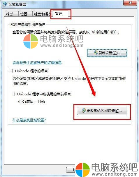 4、点击管理选项然后点击更改电脑系统区域设置;