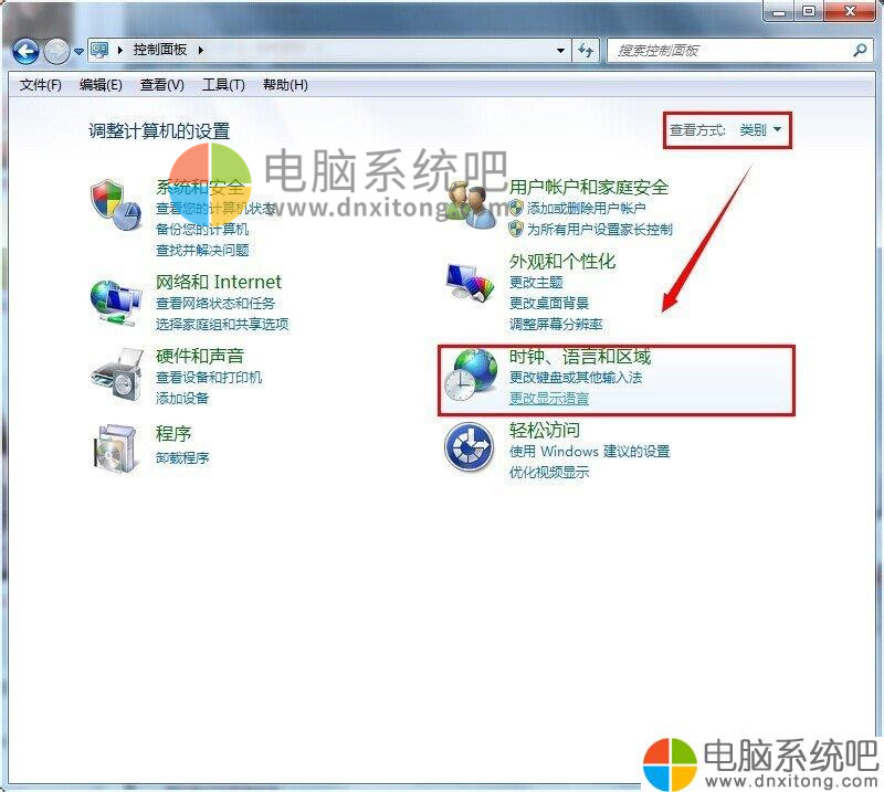 2、将查看方式设置成类别,然后点击时钟、语言和区域;