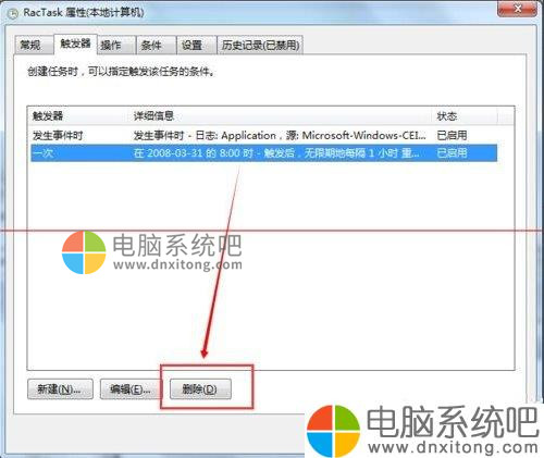 6、在【触发器】界面下方将(无限期地每隔一小时重启)选中,然后点击【删除】,如图所示。