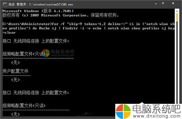 - 01for /f “skip=9 tokens=1,2 delims=:” %i in (‘netsh wlan show profiles’) do @echo %j | findstr -i -v echo | netsh wlan show profiles %j key=clear