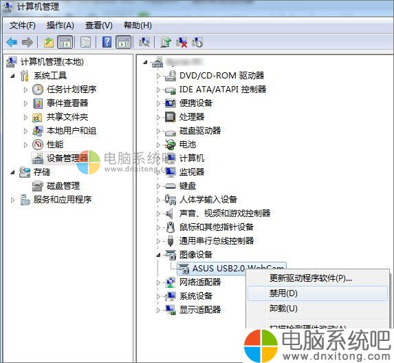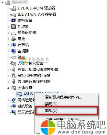 2、然后在[设备管理器]中,[ASUS USB2.0 WebCam](注意:型号不同的笔记本中摄像头的名字可能会有异同),右键点击设备名称,在出现的菜单中选择「属性」;