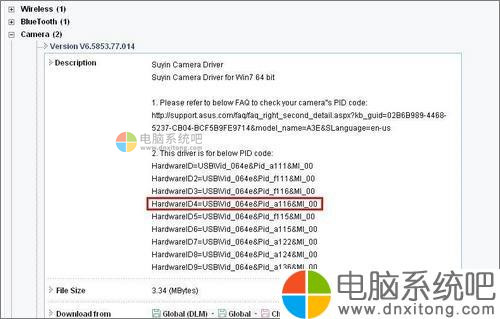 4、根据 PID 码和电脑型号在官网上找到正确的驱动。比如您的笔记本是华硕K40IE,那么就在华硕页面里(http://www.asus.com/support)输入K40IE后搜索。进入驱动程序–摄像头类别下,根据之前找到的PID码查找对应上了哪条驱动,下载安装即可;