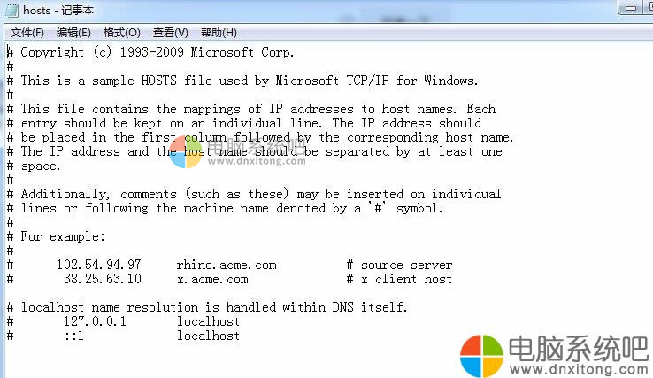 2、以文本的方式打开hosts文件之后,原始的hosts文件内容如下: