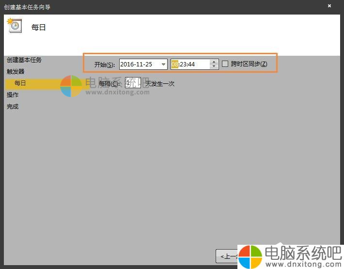 8、设置需要自动关机的时间,然后设置每隔“1”天发生一次,然后点击“下一步”。