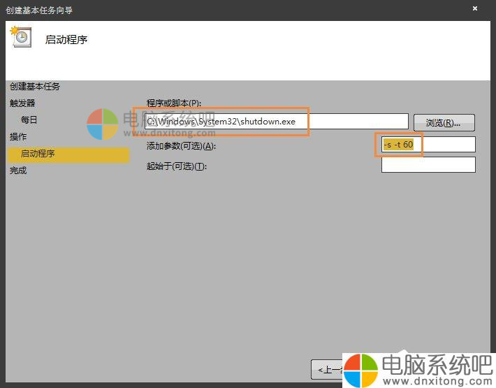 点击“浏览”,找到:C:\Windows\System32下的shutdown.exe并添加,参数填写“-s -t 60”,然后点击“下一步”。意思就是到设定时间就执行shutdown.exe关机程序,等待时间为60秒。