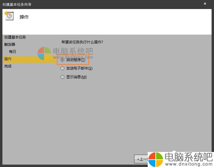 这一步设置到点儿执行的操作,选择“启动程序”,然后点击“下一步”。