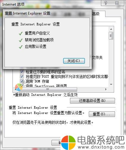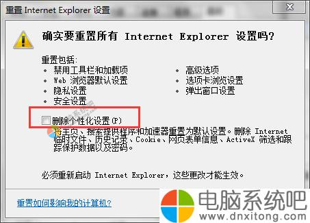 4、点击“重置”之后,IE会删除重置设置把自定义的设置和插件会禁止停用。
