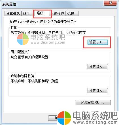 3、点击“电脑系统保护”,选择“高级”-》“性能”下的“设置”按钮。
