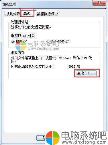 4、在性能选项窗口中,选择“高级”-》“虚拟内存”下的“更改”按钮。