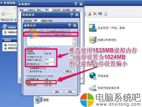 5、在这里,显示的是我原来的虚拟内存设置,我的物理内存为1G,虚拟内存设置在C盘,它推荐我设置虚拟内存设为1536MB=1.5G,但我没有按它的要求设置,我只设置了1024MB=1G。