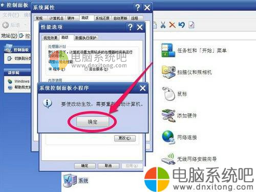 7、当按了“确定”后,会弹出提示框“要使改动生效,必须重新启动计算机”,虚拟内存设置完成。