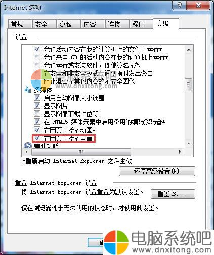 4、找到“在网页中播放声音”,打钩它,然后点击“确定”,就完成操作了,如图:
