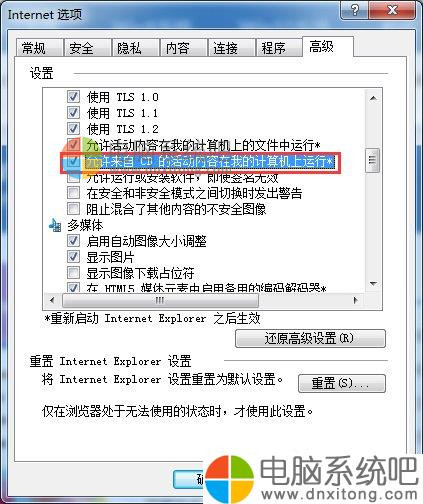 5、进入IE菜单栏–工具–Interent选项—高级,找到“允许活动的内容在我的计算机上的文件中运行”进行勾选,然后点击“确定”,如图: