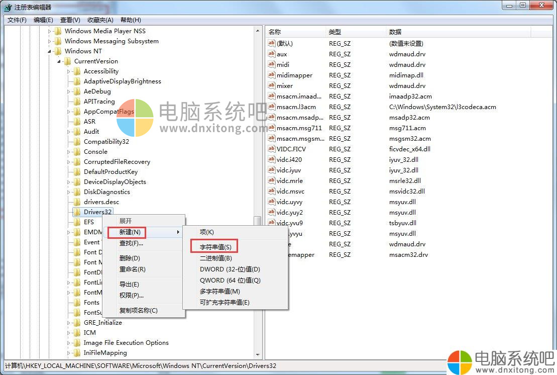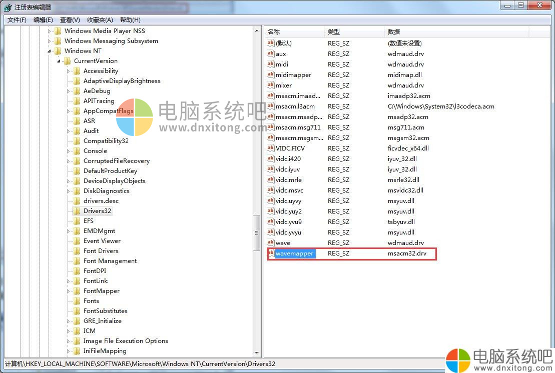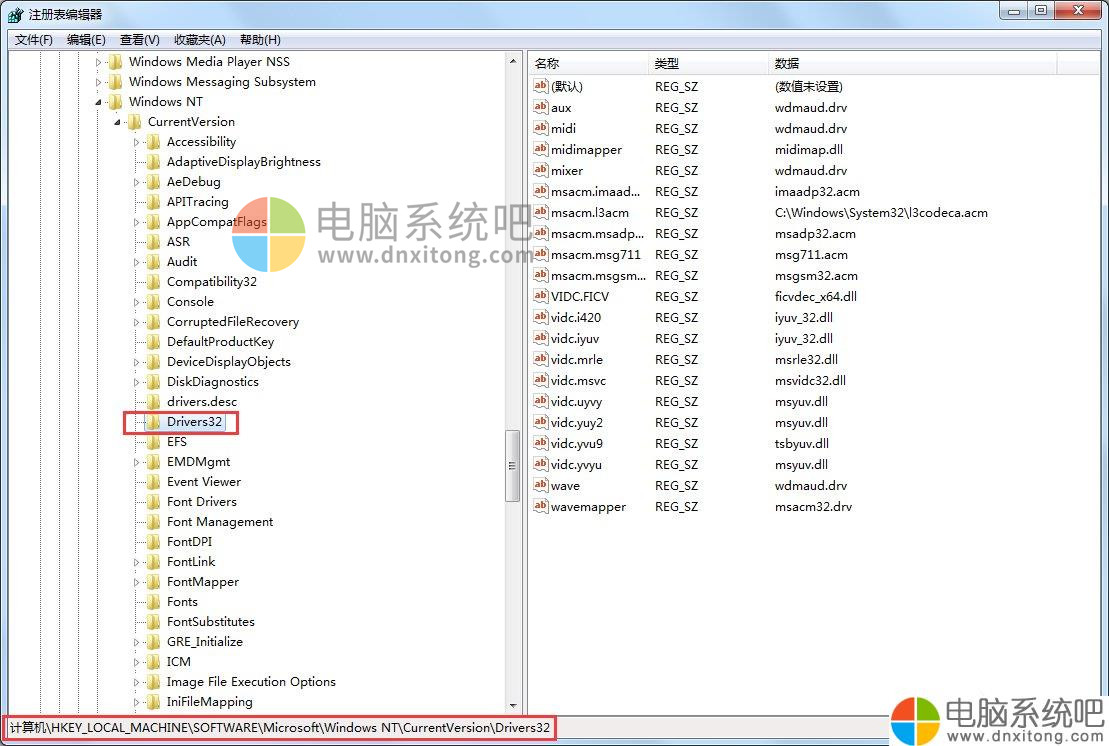 3、在注册表里找 HKEY_LOCAL_MACHINE\SOFTWARE\Microsoft\WindowsNT\CurrentVersion\Drivers32,如图: