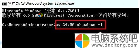 3、点击确定后,在弹出的管理窗口中设置关机时间。比如:要设置晚上12点关机,可以输入:at 24:00 shutdown -i.电脑到达24:00时候就会自动关机。具体定时关机时间可以自己设定。