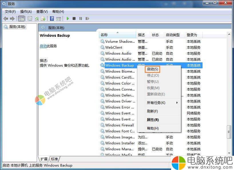 5、依次找到Windows Backup服务并右键TA→点击“启动”;