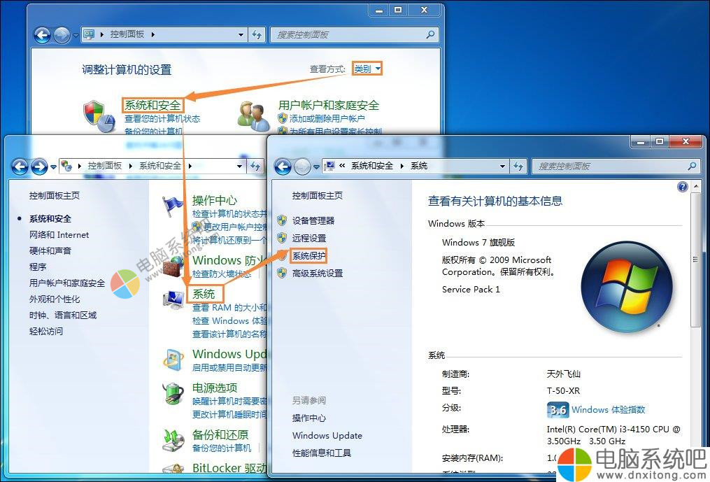 6、重启电脑,然后点击开始→控制面板→电脑系统和安全→电脑系统→电脑系统保护;