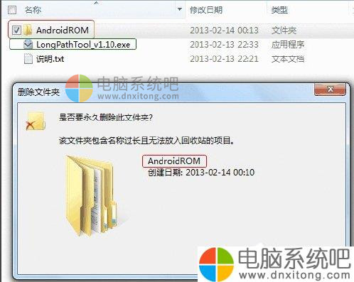 2、下载后解压,将LongPathTool_v2.20.exe拷贝到需删除文件夹的同级目录下。这里文件夹包含名称过长需删除的目录名为“AndroidROM”,错误提示如下: