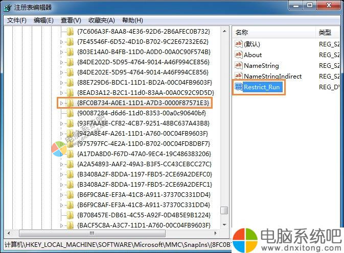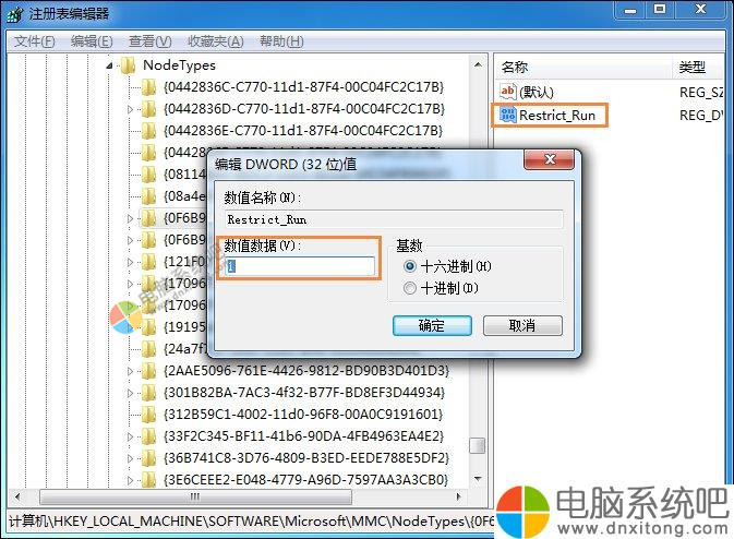 4、将“Restrict_Run ”的数值设定为成“0”(两个注册表路径中的Restrict_Run都要修改);