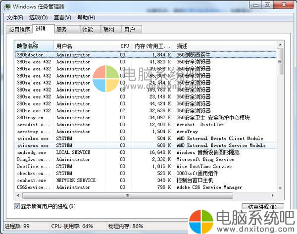 方法二:在任务管理器中结束相应的进程。同时按下Ctrl+Alt+Del组合键,打开任务管理器,在这里面查找所有启动的程序,看哪个内存占用率高就把这个程序结束,如图:
