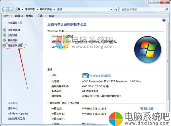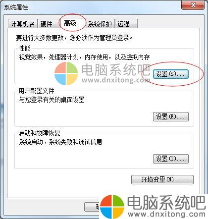 在“高级电脑系统”内选择“高级”选项,在性能下面选择“设置”,如图: