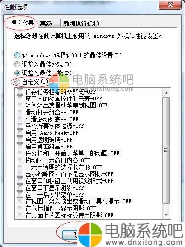在视觉效果下面取消一些没有用的特效就可以了,如图: