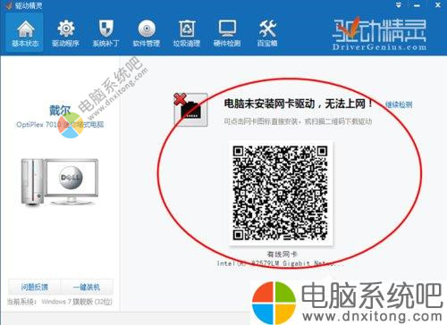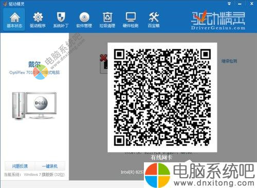 3、软件安装完成后打开该软件,软件运行后会自动检测硬件驱动的基本状态,如果电脑中没有安装网上驱动,软件将会弹出如下所示的页面。在下图中会有和本电脑网卡驱动配套的二维码图标。