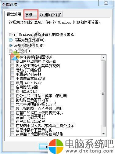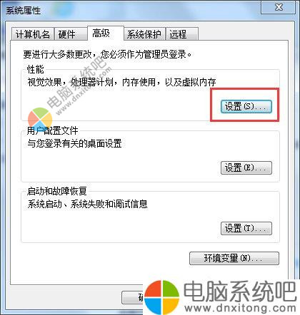 2、打开属性选项卡,选择“高级”——点击“性能”——设置——。