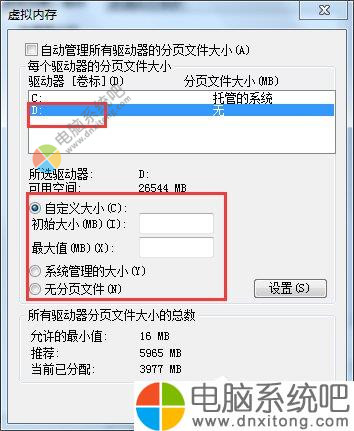 7、举个例子说明一下:假设某电脑物理内存为256M,虚拟内存放在D盘,则应:清除默认,保持C盘为选中状态——点击“无分页文件”——点击“设置”按钮,此时C盘虚拟内存就消失了——选中D盘——点击“自定义大小”,在“初始大小”和“最大值”两个框里添上256*2=512,再点一下“设置”按钮,会看到D盘的旁边出现了“512-512”的字样,这样就说明设置好了,再一路确定,最终,电脑系统会要重新启动,重启一下,便完成了设置。
