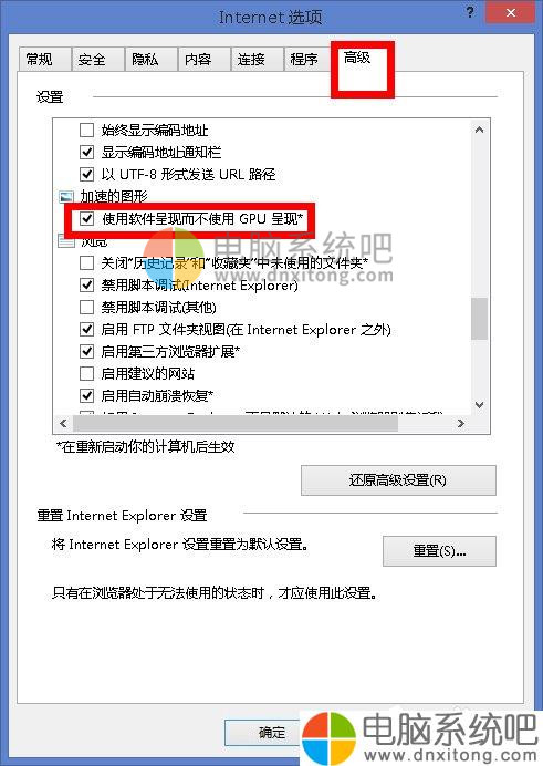 3、在高级选项卡中找到 “使用软件呈现而不使用 GPU 呈现”前面勾选!如下图所示!然后点击应用按钮!