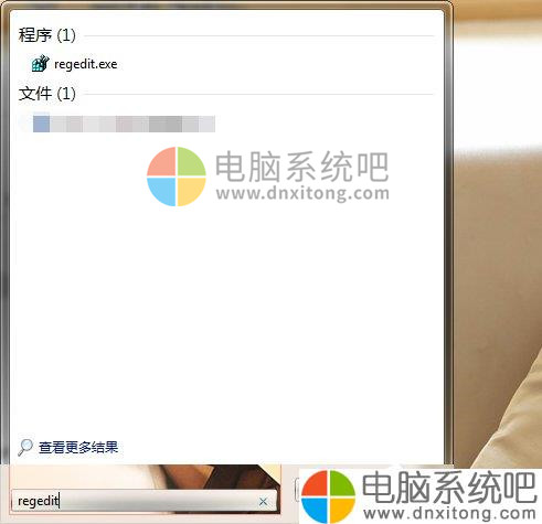 1、在开始菜单的搜索框中输入“regedit”打开注册表编辑器。