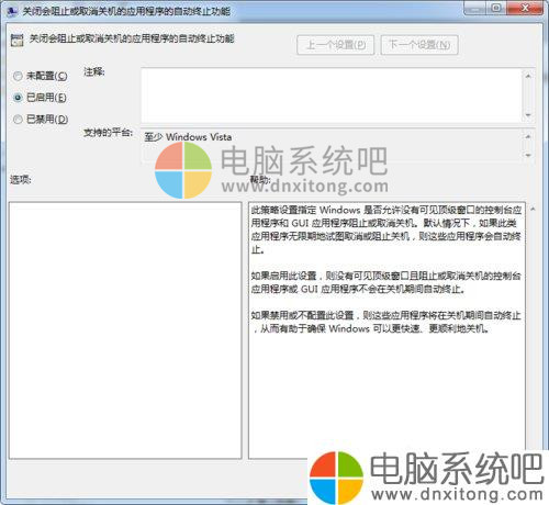 2、双击右侧的“关闭会阻止或取消关机的应用程序的自动终止功能”,在弹出的对话框里把配置修改为”已启动“就可以了。