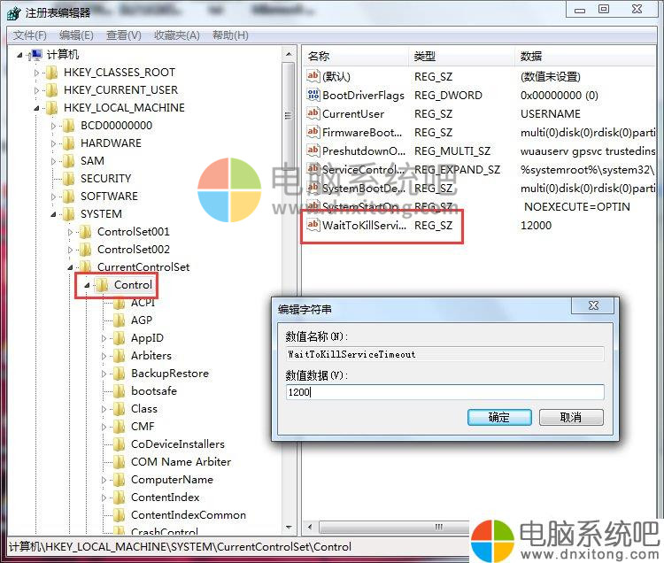 2、找到 HKEY_LOCAL_MACHINE/SYSTEM/CurrentControlSet/Control 一项 “WaitToKillServiceTimeOut”,右键点击修改可以看到win7默认数值,在这里把数值适当的修改低一些。