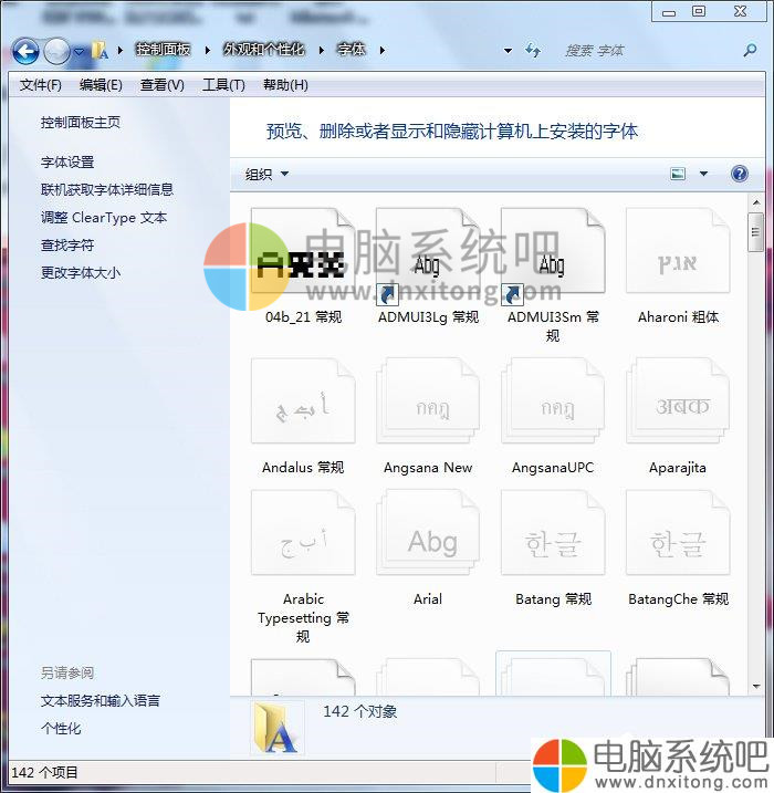 2、进入该文件夹,把不认识的字体都删除,删的越多,就得到越多的空闲电脑系统资源(如担心以后可能用到一些字体,就把不用到的字体保存到其他的文件夹里);