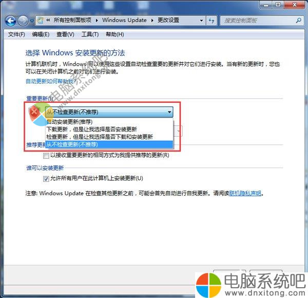 5、在“重要更新”中选择“从不检查更新(不推荐)”,并点击“确定”。这样电脑系统就不会更新。