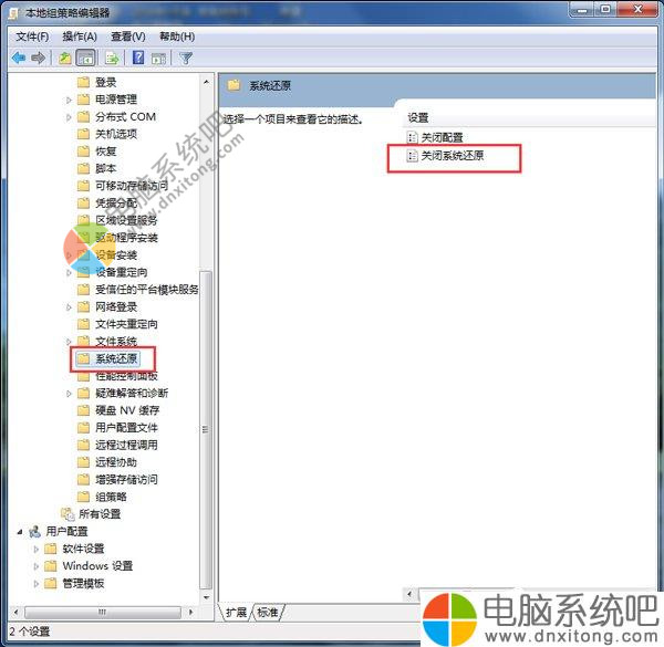 4、再接着找到“电脑系统还原”这一项,到右侧窗口,再找到“关闭电脑系统还原”。