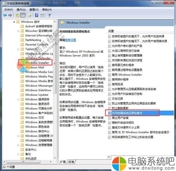 1、还要关闭创建还原点才可以,接着在Windows组件下,找到Windows Installer这一项,在右侧窗口,选择“关闭创建电脑系统还原检查点”。
