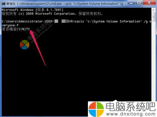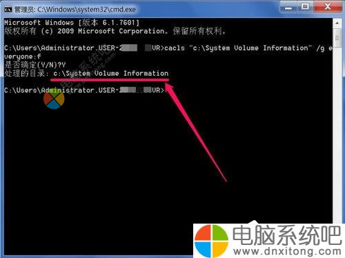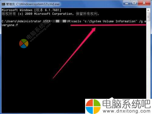 2、进入命令提示符窗口后,输入cacls “c:\System Volume Information” /g everyone:f命令,回车。