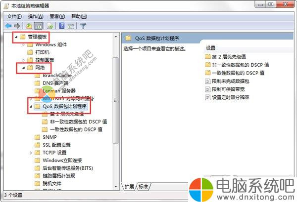 3、依次展开计算机配置-管理模板-网络-QOS数据包计划程序,最后是点击选中“QOS数据包计划程序”,无需再点击下面的选项;