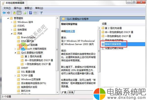 4、选中“QOS数据包计划程序”后,我们在右面相应选中限制可保留带宽,双击进入限制可保留带宽的设置,默认是未配置的,我们在帮助区可以看到,如果禁用或不配置,电脑系统会默认限制20%带宽。